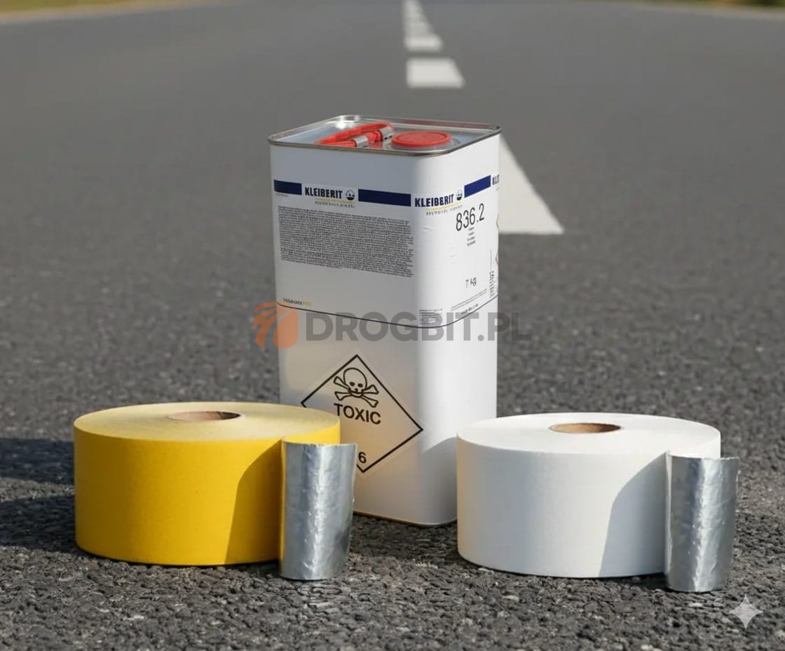 Klej do taśm drogowych KLEIBERIT 836.2 jest łatwy w użyciu, co znacznie przyspiesza prace drogowe. Może być aplikowany ręcznie za pomocą wałka lub pędzla, a także maszynowo, co pozwala na dostosowanie metody do skali projektu. Ważne jest, aby powierzchnia była sucha i czysta, co zapewni optymalne rezultaty. Po przyklejeniu taśmę należy docisnąć.