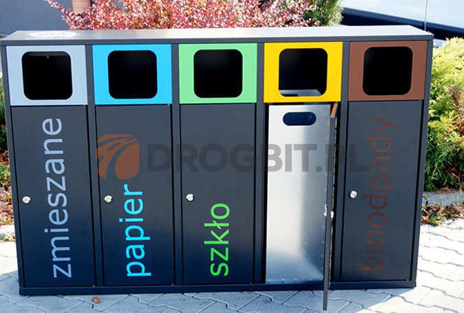 Kosz do segregacji śmieci składa się z pięciu modułów, każdy po 40 litrów. Kosze wykonane są z blachy 1 mm, stal ocynkowana i malowana lub stal nierdzewna. Istnieje możliwość wyboru koloru pojemników z palety RAL. Na pojemnikach widnieją napisy z folii samoprzylepnej, które wskazują na ich przeznaczenie. Segregacja śmieci z naszymi pojemnikami jest o wiele łatwiejsza i przyjemniejsza. Polecamy również inne śmietniki do segregacji modułowe, które można znaleźć w naszej ofercie.