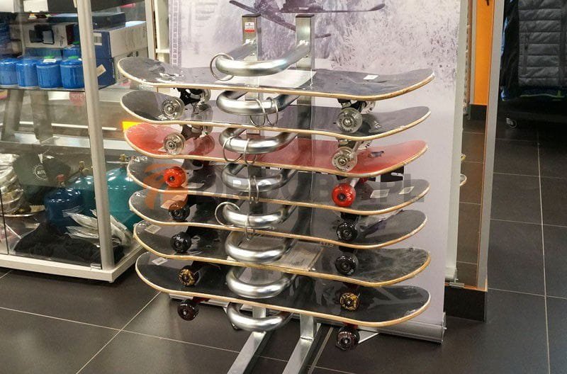 Stojak na deskorolki pomieści 7 deskorolek. Dzięki specjalnemu zapięciu umożliwia zabezpieczenie deski przed kradzieżą. Stojak może również służyć jako stojak ekspozycyjny w sklepie z deskorolkami.