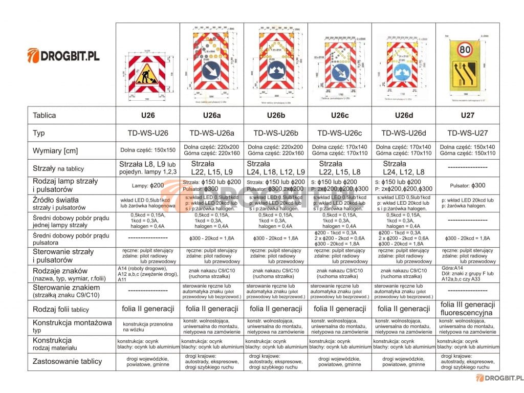 • tablice U-26b, U-26d – z funkcją sterującą (w lewo, w prawo lub prawo i lewo jednocześnie – wyłączenie pasa ruchu).