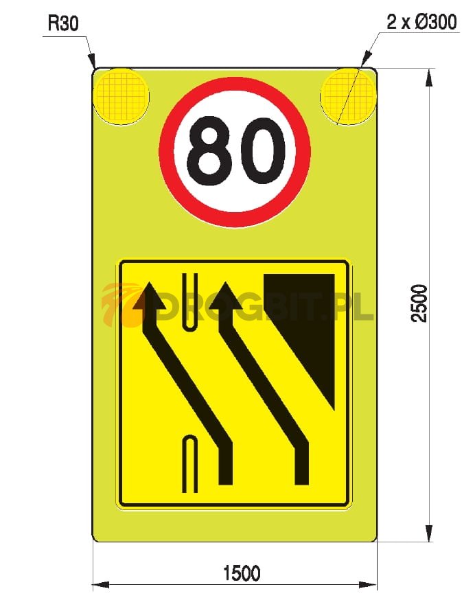 - tablica: blacha ocynkowana lub aluminiowa wyklejona folią pryzmatyczną odblaskowo-fluorescencyjną barwy żółto-zielonej,
