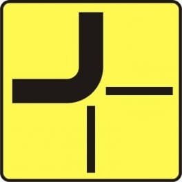 • T-6a/1 - tabliczka wskazująca rzeczywisty przebieg drogi z pierwszeństwem przez skrzyżowanie (umieszczana na drodze z pierwszeństwem)