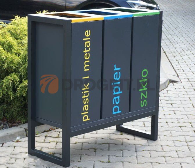 Kosz wolnostojący do segregacji odpadów, składa się z trzech modułów, każdy z nich ma pojemność równą 60 litrów. Istnieje możliwość doboru odpowiedniego koloru z palety RAL. Kosz do segregacji jest przeznaczony do użytku wewnętrznego. Kolorystyka odpowiada przepisom określonym przez Ministerstwo Środowiska.