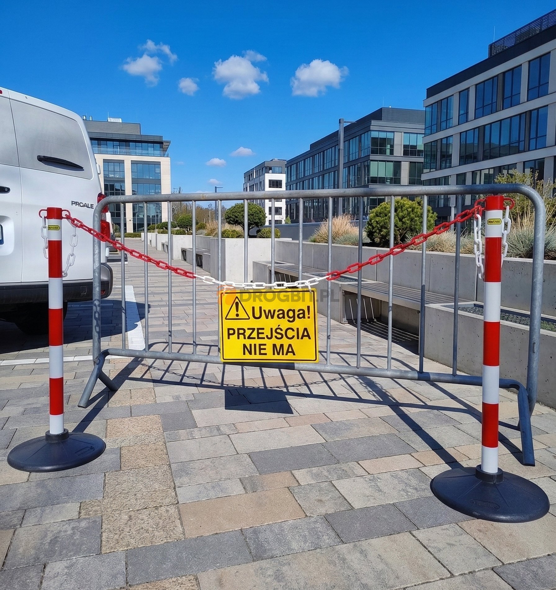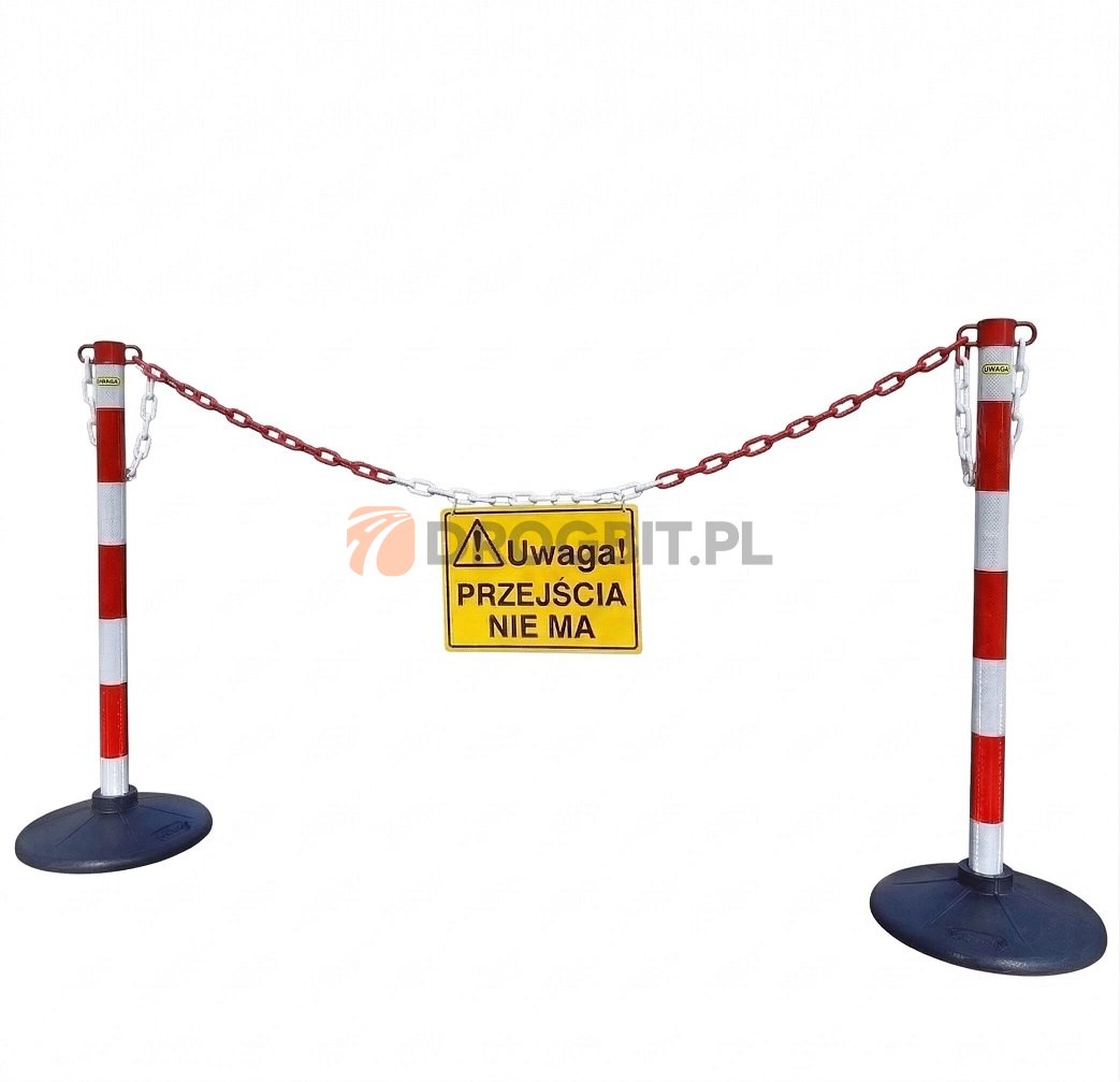 Zestaw - słupki PCV z łańcuchem i tablicą ostrzegawczą - wersja biało - czerwona
