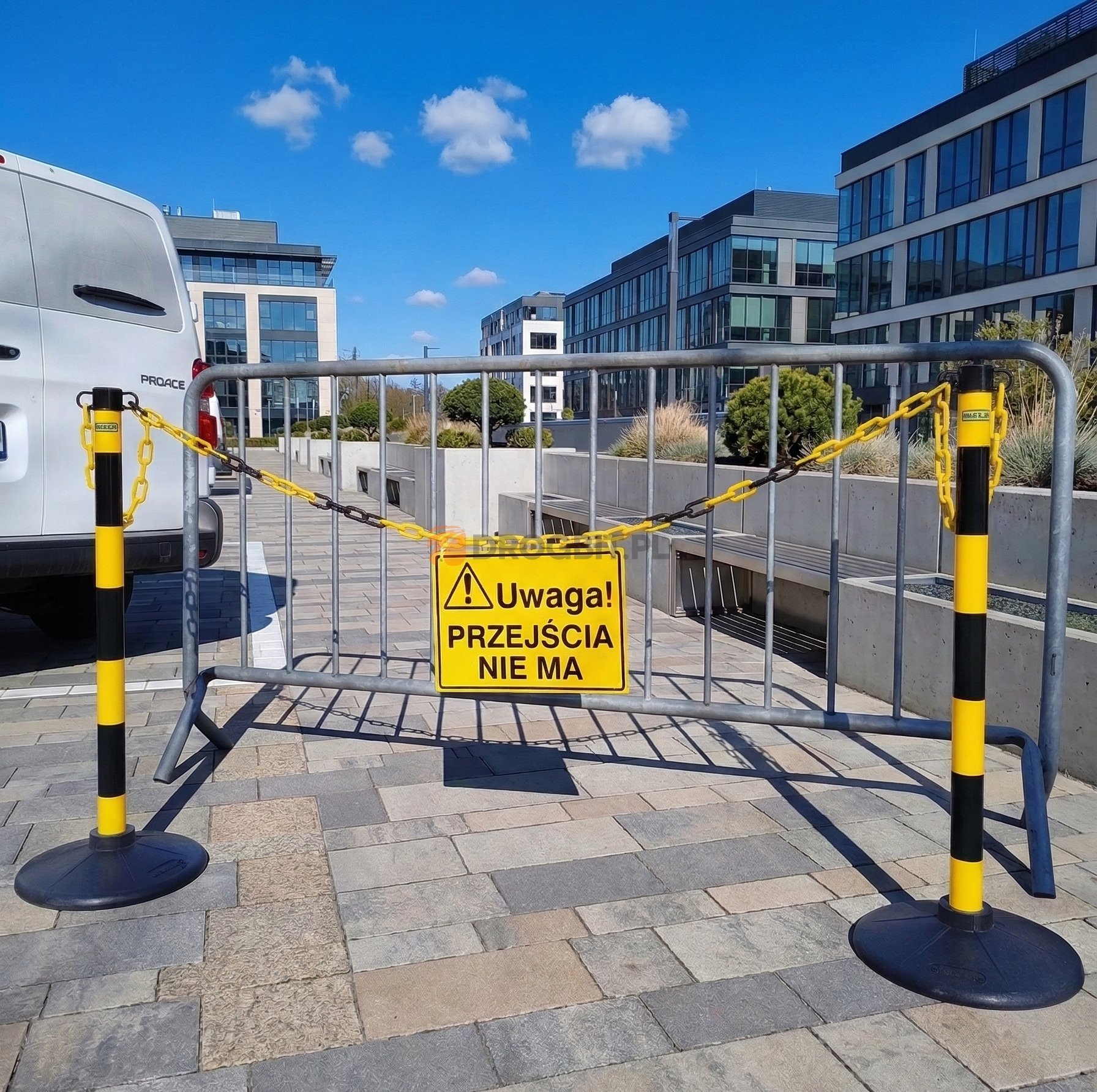 Zestaw - słupki PCV z łańcuchem i tablicą ostrzegawczą - wersja żółto-czarna