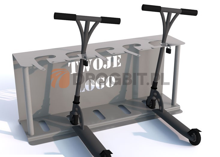 Stojak na posiada specjalnie wycięte miejsca na hulajnogi. Wycięcie pozwala na stabilne umiejscowienie hulajnogi, a także na swobodne przymocowanie jej do stojaka. Dzięki temu możemy zostawić hulajnogę w miejscu publicznym, nie martwiąc się o to, że ktoś może ją przywłaszczyć. Stojak jest dostępny w trzech wersjach: stal ocynkowana, stal ocynkowana i pomalowana, a także stal nierdzewna. Stojak w standardzie posiada 5 stanowisk do parkowania, aczkolwiek istnieje również możliwość rozbudowanie stojaka o kolejne stanowiska. W cenie zawarty jest indywidualny projekt graficzny - miejsce na Twoje logo.
