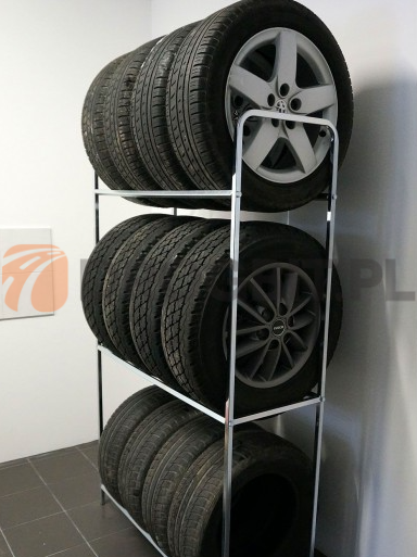 Pionowy stojak do przechowywania opon. Stojak pomieści maksymalnie 12 opon zarówno z felgami jak i bez. Stojak oparty jest na konstrukcji o profilu równym 20x20x1,5 mm. Konstrukcja jest stabilna i bezpieczna w użytkowaniu. Po ułożeniu opon na stojaku, stykają się one pod płaskim kątem z profilami i nie ruszają się. Dzięki takiemu położeniu opony nie tracą swoich właściwości. Stojak sprawdzi się w garażu, piwnicy oraz w zakładzie wulkanizacyjnym, stojak może służyć także jako półka ekspozycyjna w sklepie branżowym.
